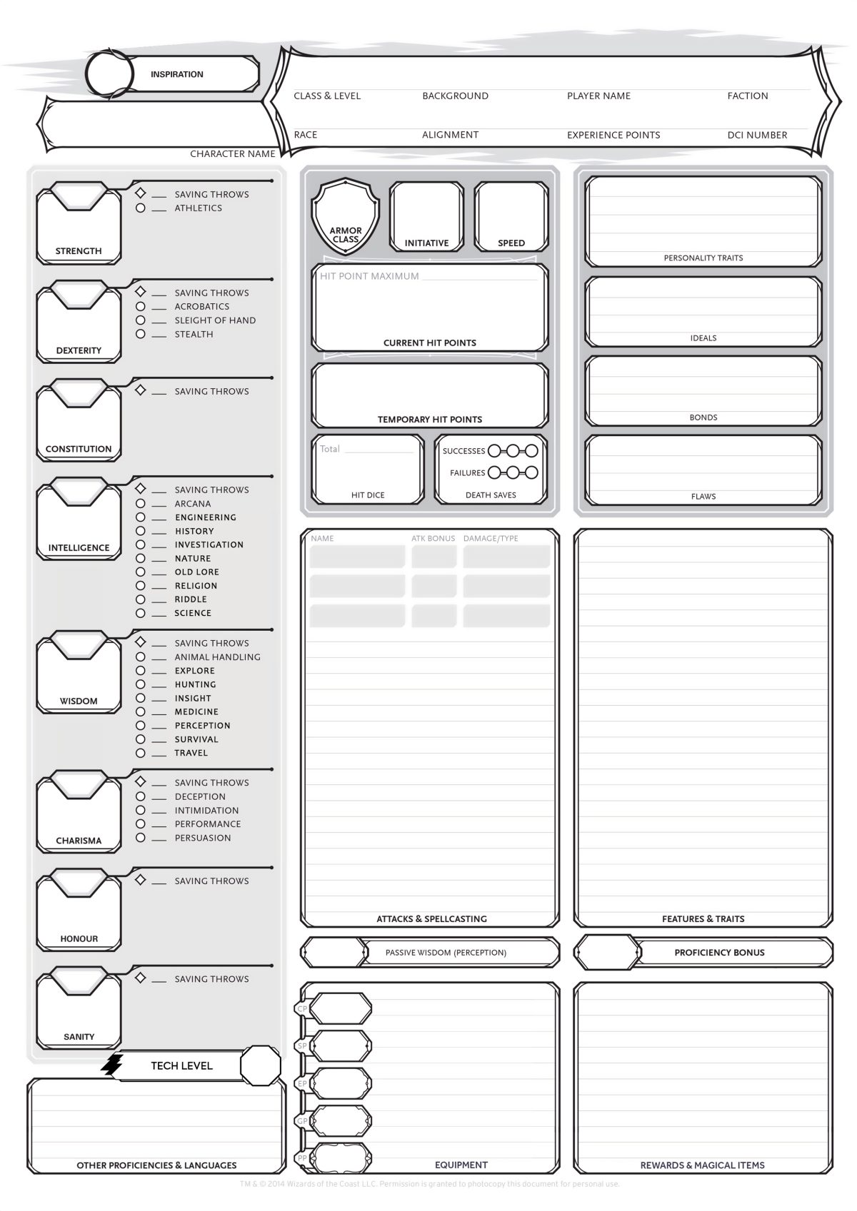 Categories Featured Role-Playing Games Gray’s Custom D&D 5e Character Sheet Post author By Gray Post date January 24, 2015 Reading Time: < 1 minuteContinue reading “Gray’s Custom D&D 5e Character Sheet” Tags Dungeons & Dragons