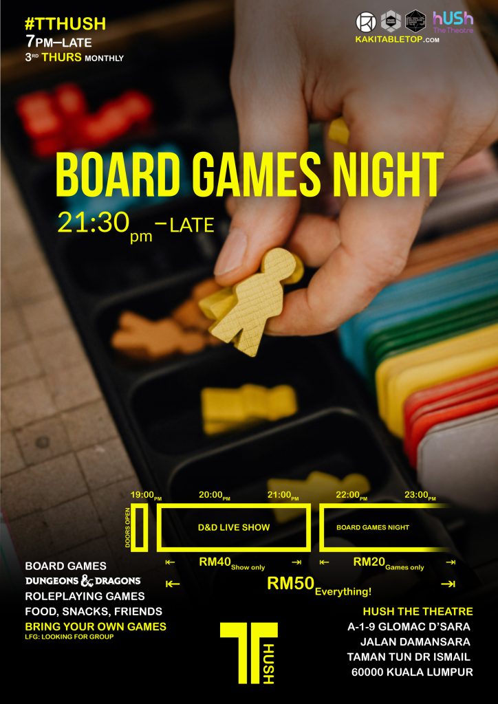 🏰🐉⚔️🎴🎲♟️ Join us for a night of Board Games, RPGs, snacks and drinks at #TTHUSH, a new Tabletop Games meetup sandwiched between Kuala Lumpur & Petaling Jaya 🗓️ Third Thursday nights of the month, evening till late. Bring your own games! #TTHUSH Board Games, RolePlaying Games, Food, Drinks, Friends, etc. 🦖 A Meetup for Beginners, Gamers, Game Masters, and anyone who’s Looking for a Group of new friends to play with… join in and play some games with us!