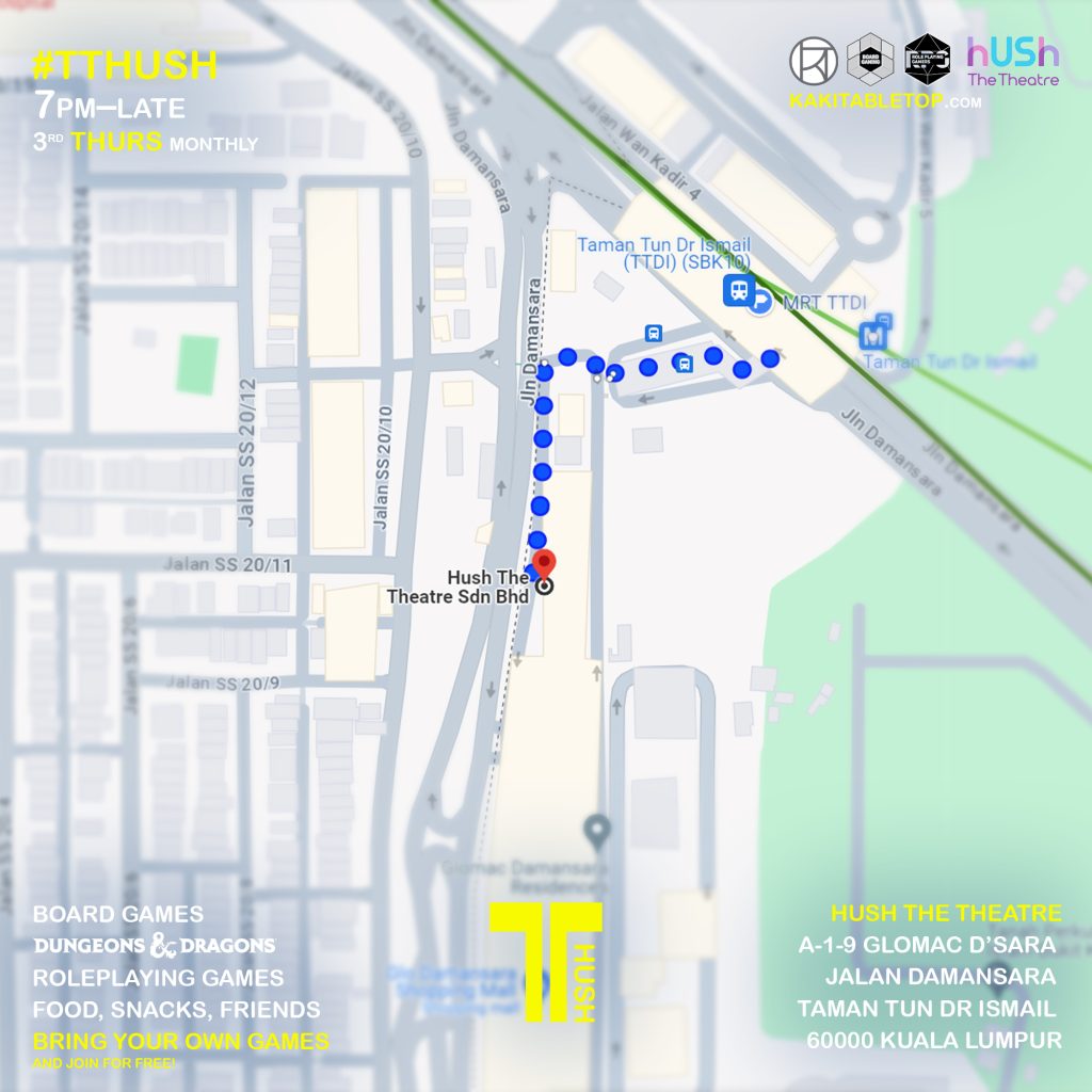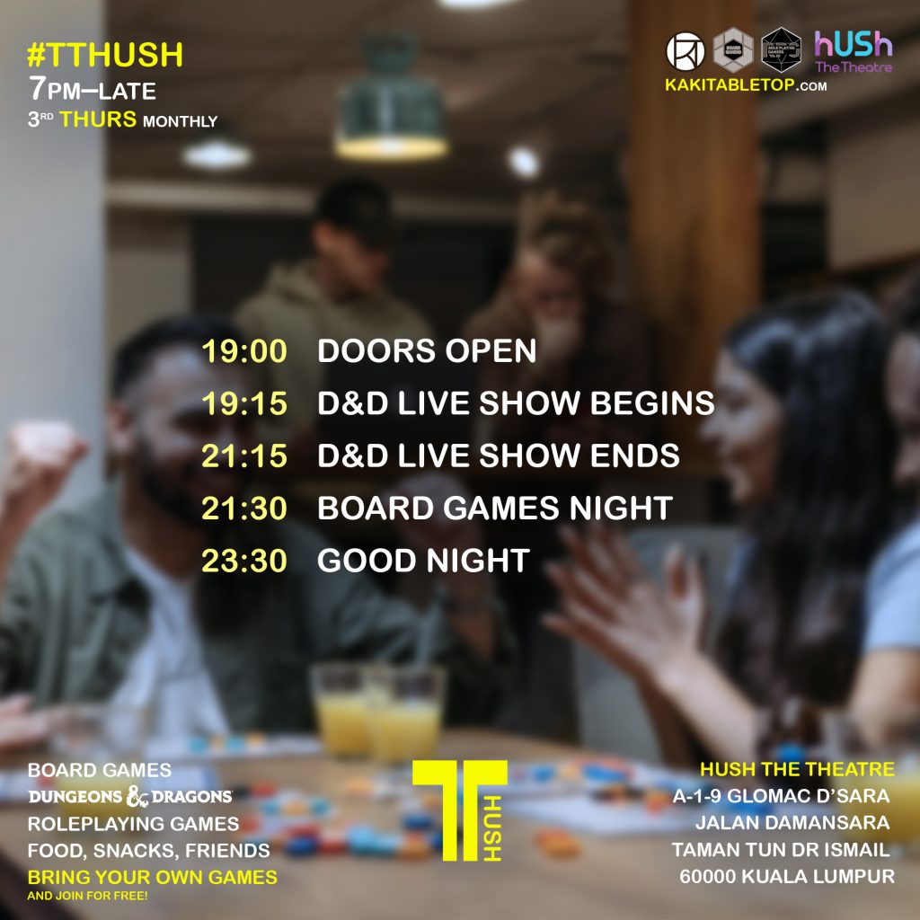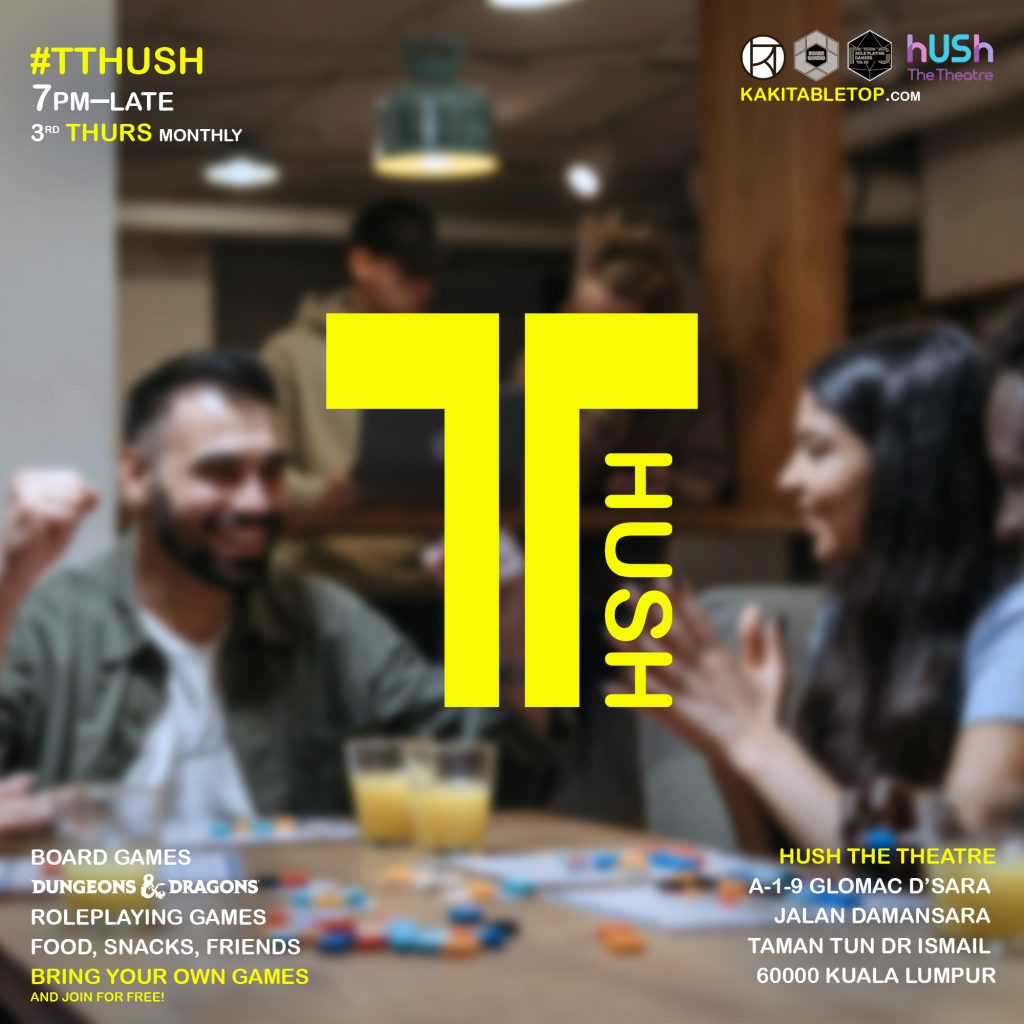 Join us for a night of Board Games, RPGs, snacks and drinks at #TTHUSH, a new Tabletop Games meetup sandwiched between Kuala Lumpur & Petaling Jaya 🗓️ Third Thursday nights of the month, evening till late.