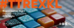 Reading Time: < 1 minute🗓️ First & Last Wednesday nights of the month, evening till late. 🦖 A Meetup for Beginners, Gamers, Game Masters, and anyone who’s Looking for a Group of new friends to play with… Stomp in and play some games with us! LFGLooking For a Group?? You can bring your own games too! There’ll also be … Continue reading #TTREXKL February / March 2023